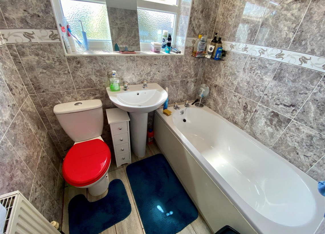 Bathroom - 1.63m x 1.79m (5'4" x 5'10") - Fully tiled bathroom to the first floor with white suite to include bath, W/C and hand wash basin.