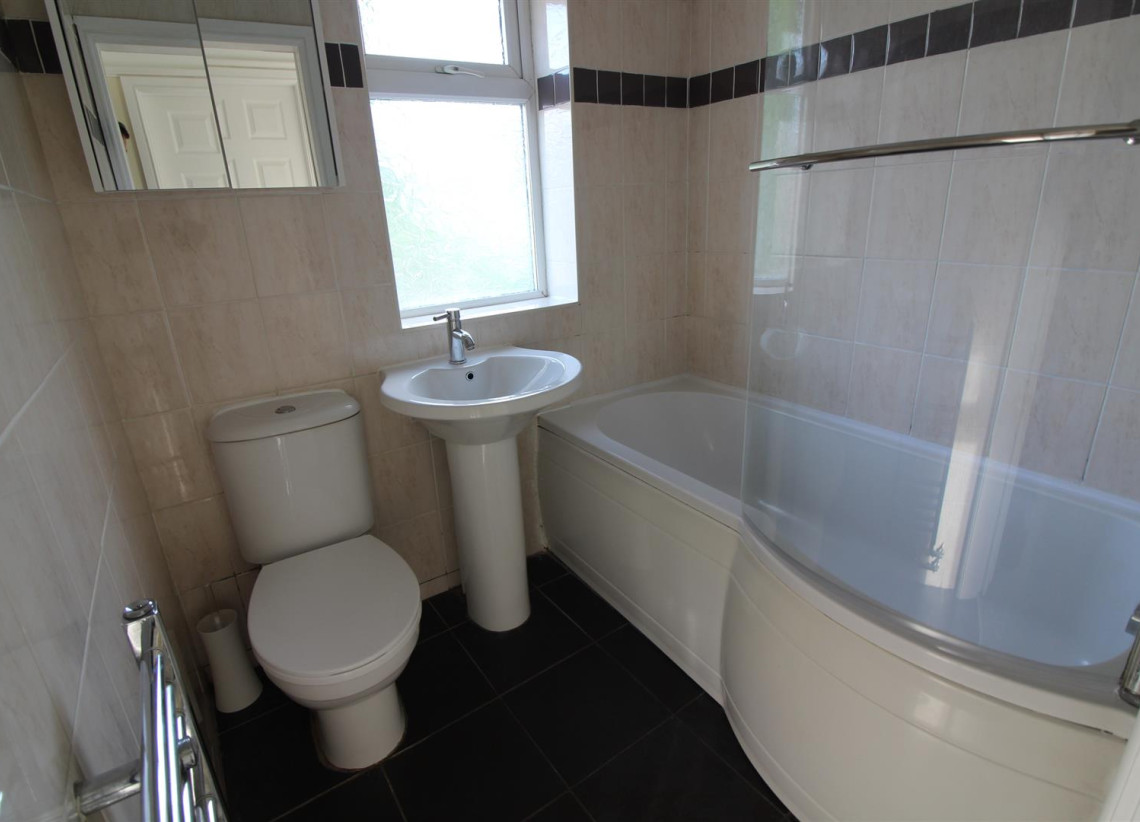 Bathroom - 2.00m x 1.87m (6'7" x 6'2") - Double glazed window to rear with privacy glass. Fully tiled bathroom with white suit to include P-Shaped bath with electric shower over, W/C and hand wash basin