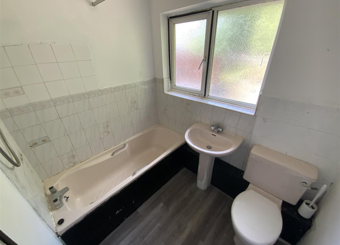 Bathroom Double glazed window to rear with privacy glass, part tiled bathroom with pink suite to include bath with shower over, W/C and hand wash basin.