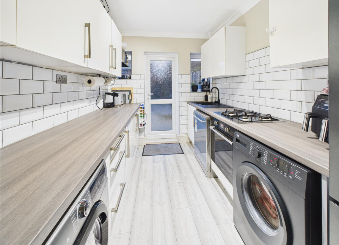 Kitchen - 2.24m x 3.60m (7'4" x 11'9") - Double glazed windows to rear and UPVC door to garden. Galley style modern kitchen with a range of wall and base units and integrated gas hob and electric oven.