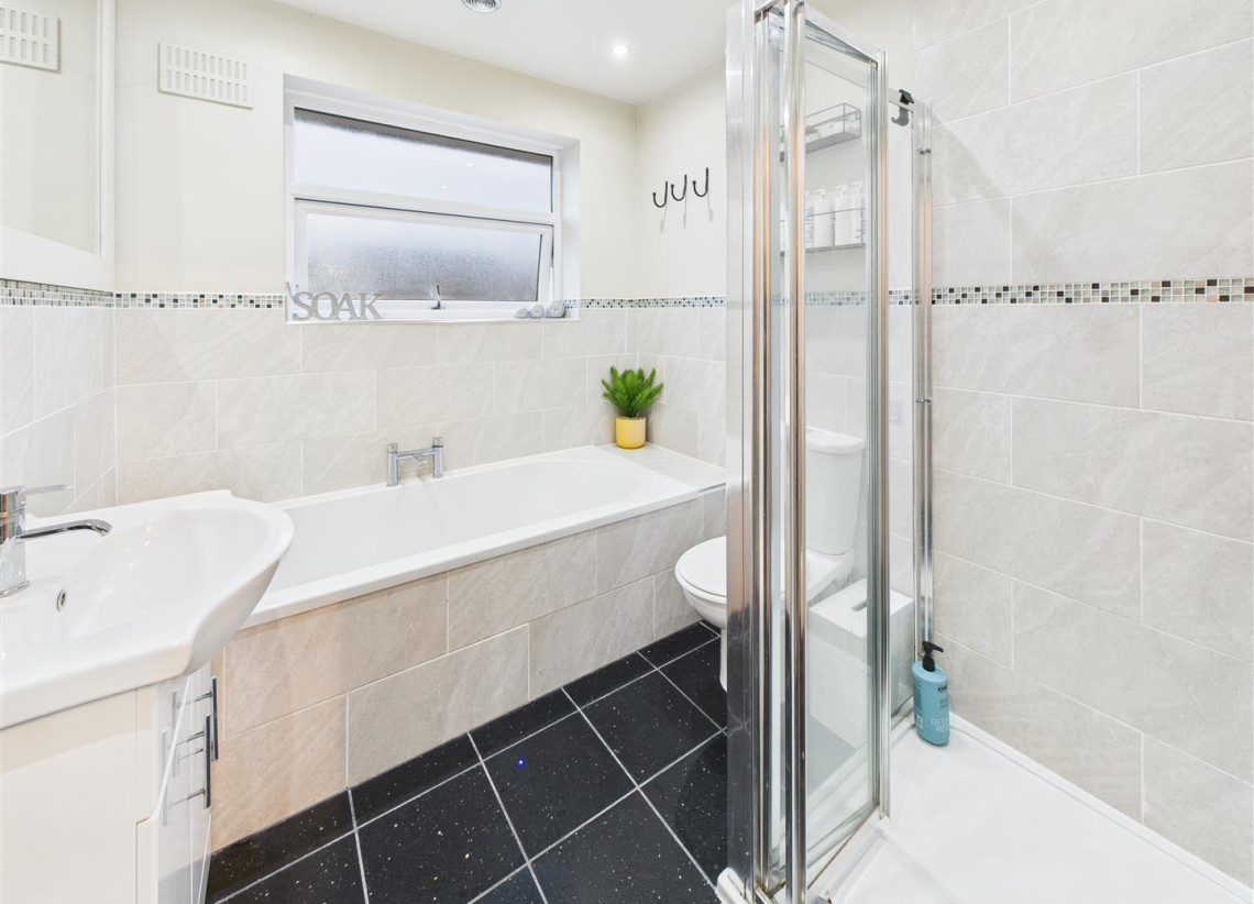Bathroom - 2.09m x 2.38m (6'10" x 7'9" ) - Double glazed window to rear with privacy glass, larger than average bathroom with white suite to include bath, separate shower cubicle, W/C and hand wash basin.