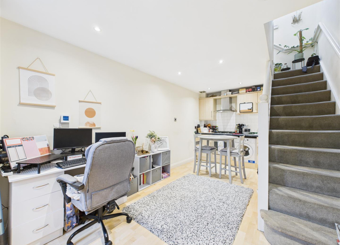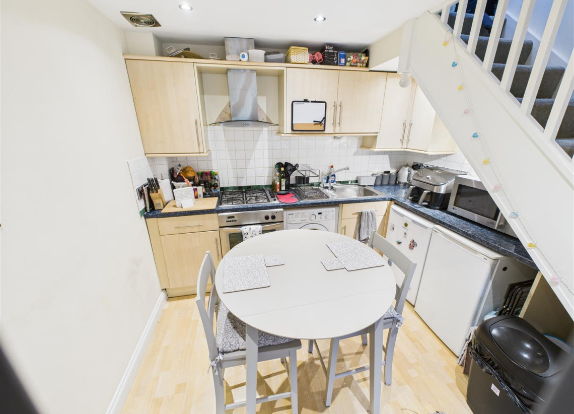 Open Plan Kitchen/Reception - 2.91 x 4.96 (9'6" x 16'3") - Entrance through timber stained front door with double glazed obscure glass panes, laminated flooring, timber stained double glazed window to front aspect, double radiator, spot lights to ceiling, alarm keypad, consumer unit, security sensor along with the kitchen to include a range of wall and base units with single sink and drainer, stainless steel chimney hood extractor, Newhome electric oven, four ring gas hob and space for a washing machine and under counter fridge and freezer.