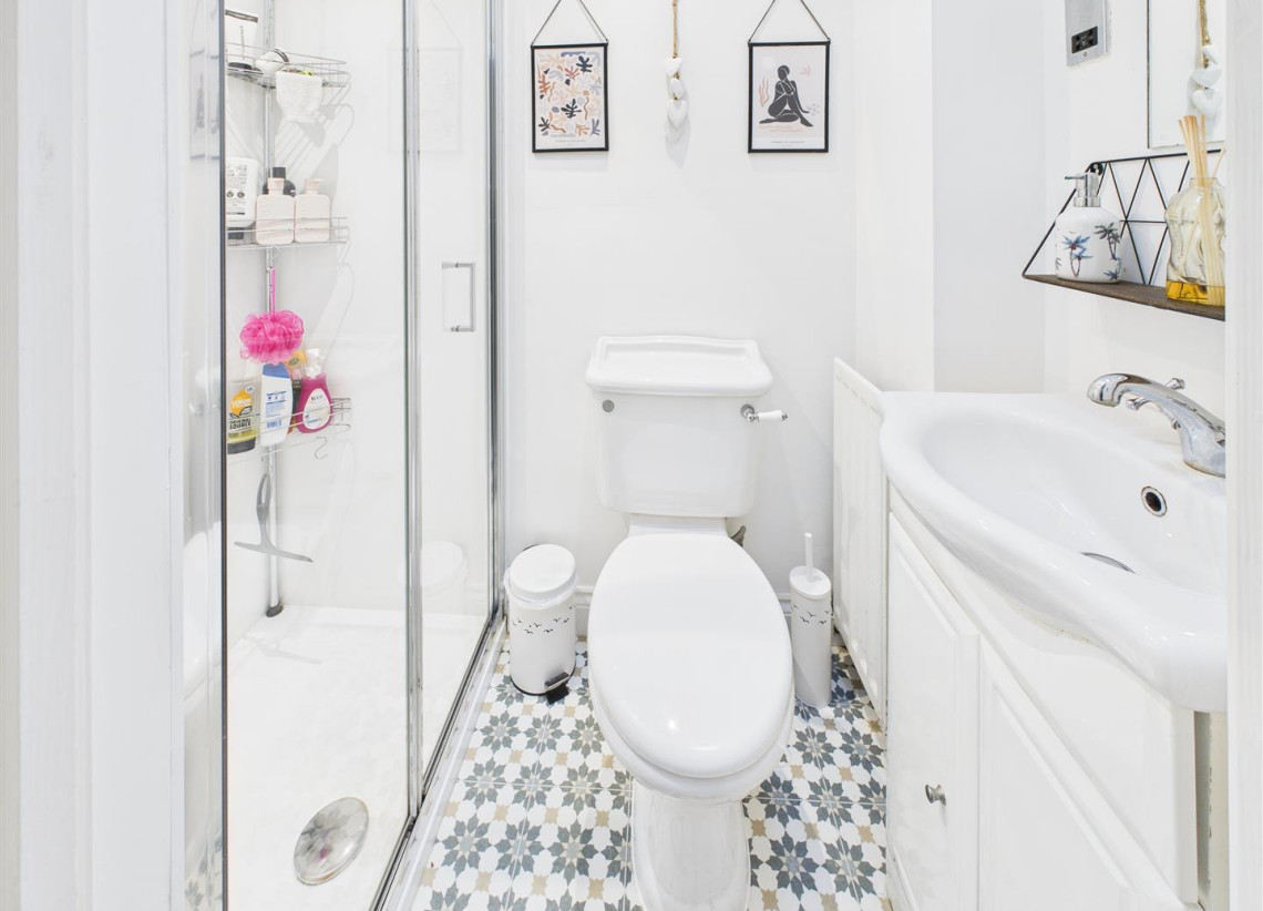 Shower Room - 1.08 x 1.88 (3'6" x 6'2") - Velux window, vinyl flooring, single radiator, electric shaving socket, Addvent extractor fan, spot lights to ceiling, vanity sink unit and bowl with mixer taps, low flush W/C and a shower enclosure with thermostat controlled shower.