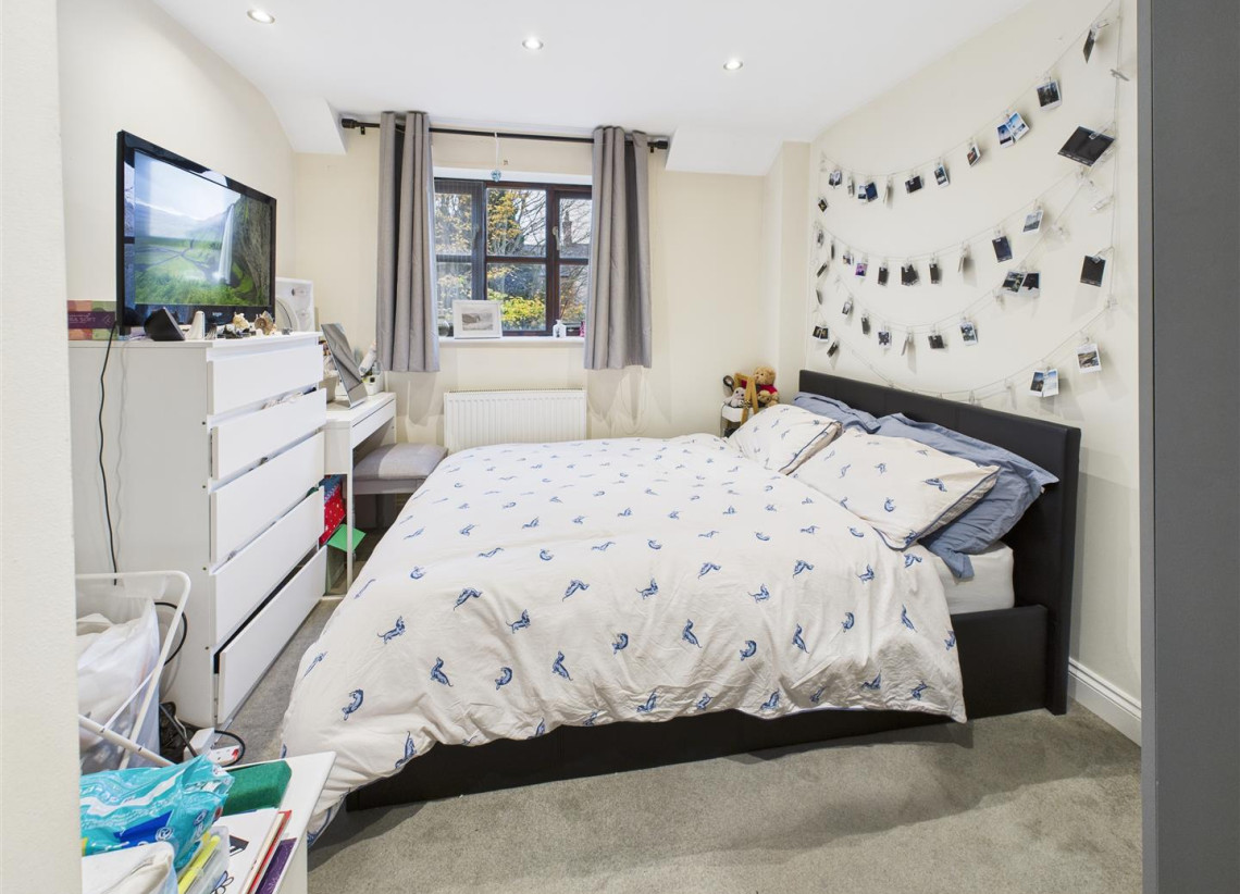 Bedroom - 2.92 x 3.03 (9'6" x 9'11") - Timber stained double glazed window to front aspect, wall to wall fitted carpet, double radiator, loft hatch and frame, spot lights to ceiling along with overhead bulk storage housing the combi-boiler.