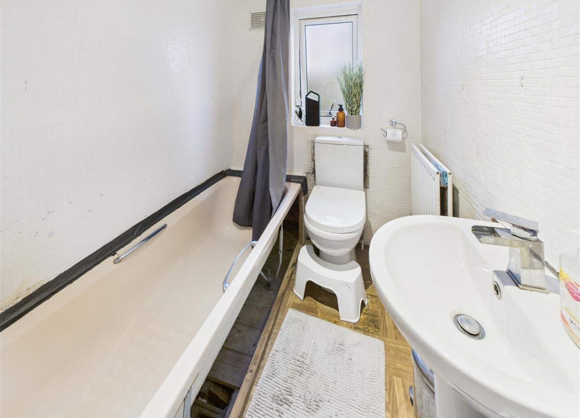 Bathroom - 1.54m x 1.78m (5'0" x 5'10") - Double glazed window to rear with privacy glass, tiled bathroom with white suite to include bath, W/C and hand wash basin.