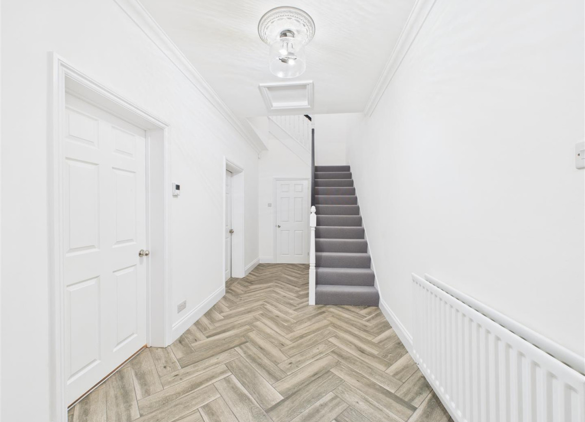 Entrance Hall - 5.96 x 2.14 (19'6" x 7'0") - Double glazed window and door with No. 1 etched into the glass above the door and thoughtfully designed cornice which blends beautifully and tastefully into the decor. There is a thermostat control, electric cupboard housing electric meter, dog leg designed staircase leading to the first floor, loft hatch, radiator and Herringbone tiled flooring.