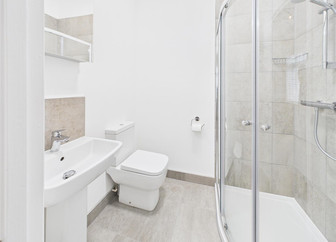 En-suite - 1.52 x 1.89 (4'11" x 6'2") - Shower cubicle with thermostatically controlled shower, pedestal wash hand basin, low flush w.c. and Porcelanosa wall and floor tiles.