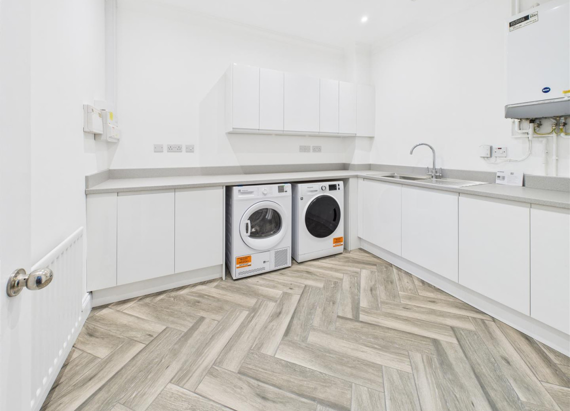 Laundry Room - 2.93 x 2.59 (9'7" x 8'5") - Good sized laundry room with wall and base mounted units, stainless steel sink unit with mixer tap, Baxi boiler, fusebox, loft hatch, Hotpoint washing machine and separate dryer and Herringbone tiled flooring.