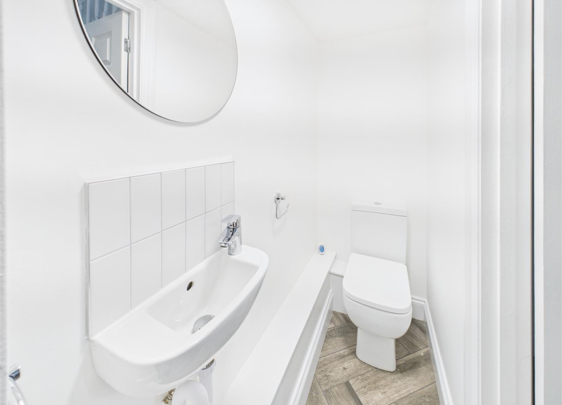 Ground Floor Cloakroom Low flush w.c., wash hand basin with wall mounted mirror and Herringbone tiled flooring.