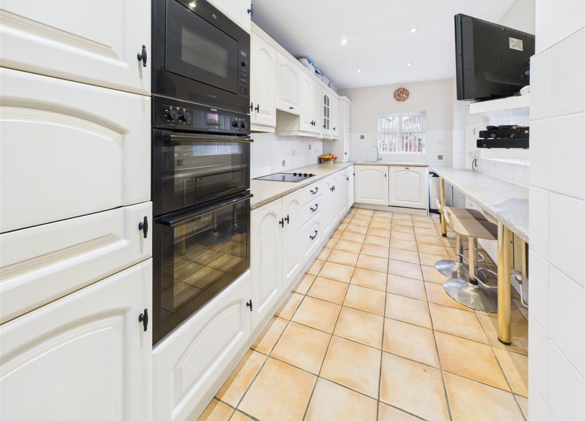 Kitchen - 5.90m x 2.24 (19'4" x 7'4") - Double glazed dual aspect windows, fitted kitchen with breakfast bar and a range of wall and base units and integrated appliances to include electric hob, oven, microwave, grill, fridge/freezer and washing machine.