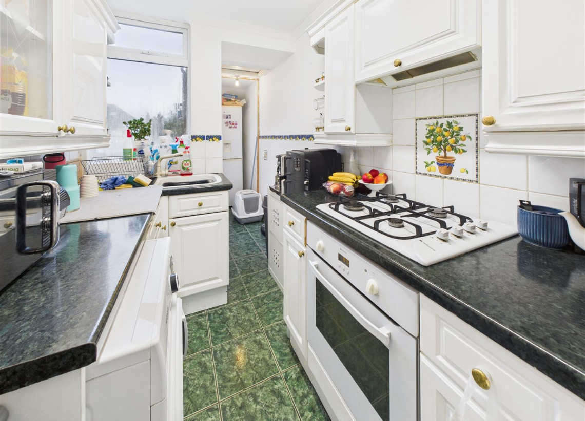 Kitchen - 1.84m x 2.85m (6'0" x 9'4") - Double glazed windows to side, fitted kitchen with a range of wall and base units to include integrated gas hob and electric oven. With UPVC door to garden.
