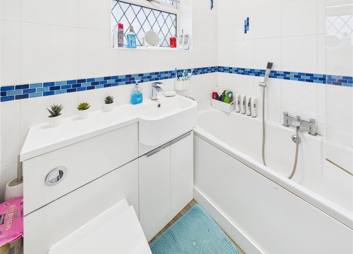 Bathroom - 1.87m x 1.68m (6'1" x 5'6" ) - Double glazed window to rear with privacy glass, tiled bathroom with white suite to include bath with shower over, W/C and hand wash basin.