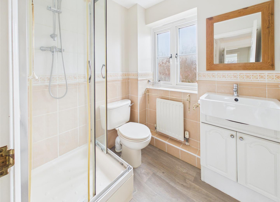 En-Suite - 1.78 x 1.62 (5'10" x 5'3") - Obscure glass UPVC double glazed window to front aspect, vinyl flooring, single radiator, low level W/C, vanity unit mounted hand wash basin, shower encloser with mixer shower, electrical shavers socket and extractor fan.