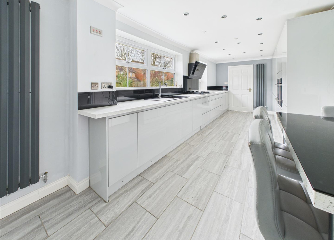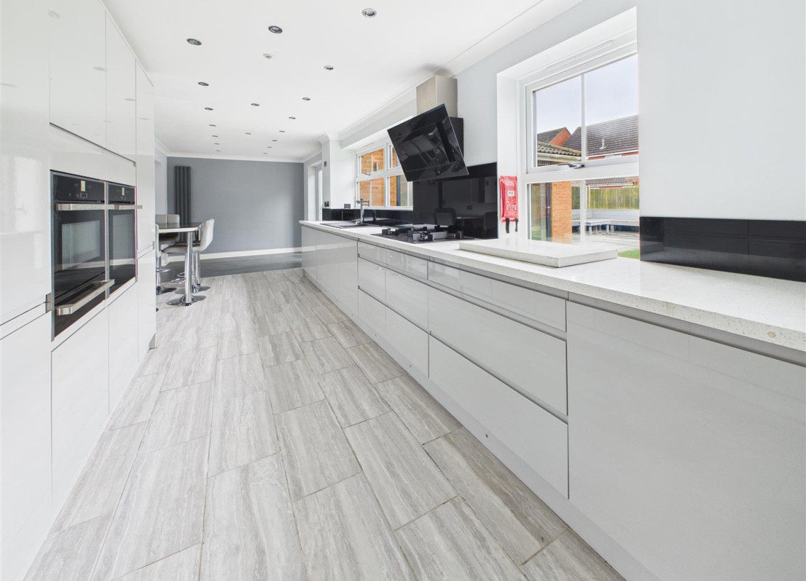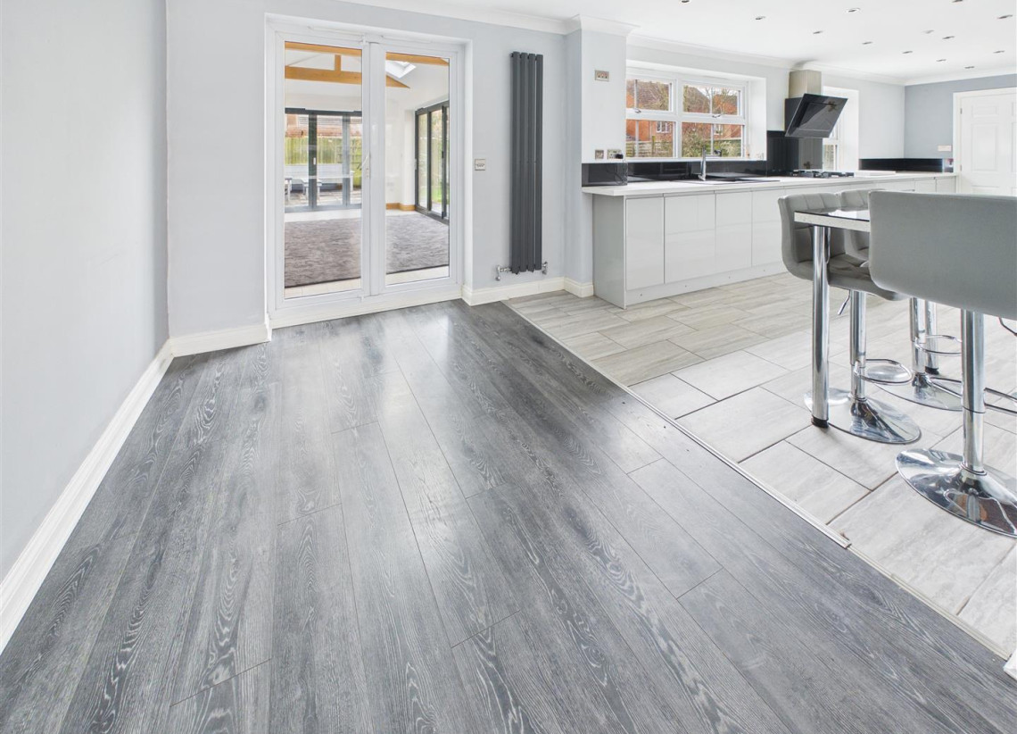 Open Plan Kitchen/Living Area - 8.90 x 2.83 (29'2" x 9'3") - UPVC double glazed French doors to Orangery/Sun room, two UPVC double glazed windows to rear aspect, laminated flooring to dining area along with tiled flooring to kitchen, three anthracite flat panelled vertical radiators, fitted breakfast table along with a modern fitted flat panelled kitchen to include integrated full length fridge, full length freezer, integrated NEFF electric oven, integrated NEFF microwave, modern NEFF chimney hood, five ring gas hob, single bowl sink with mixer tap and drainer. Storage/Pantry area with internal access to the double garage.