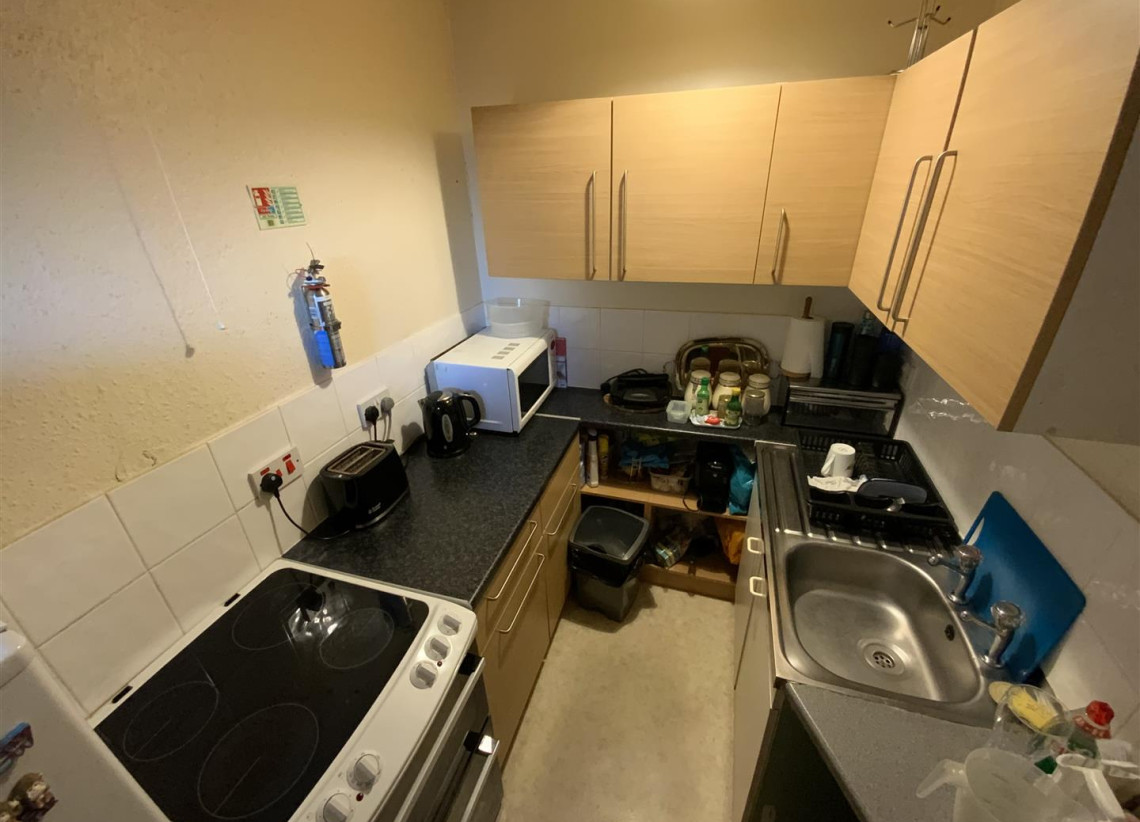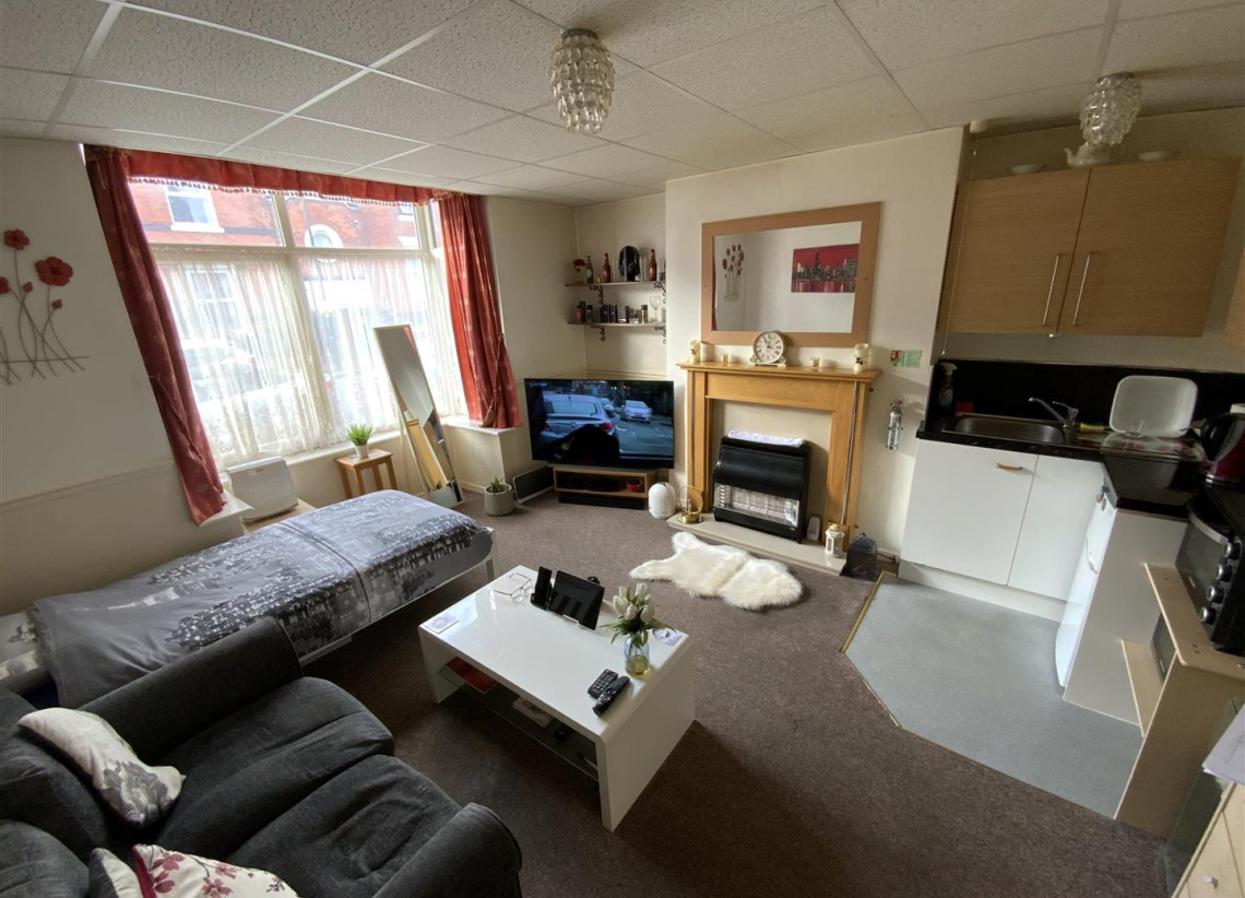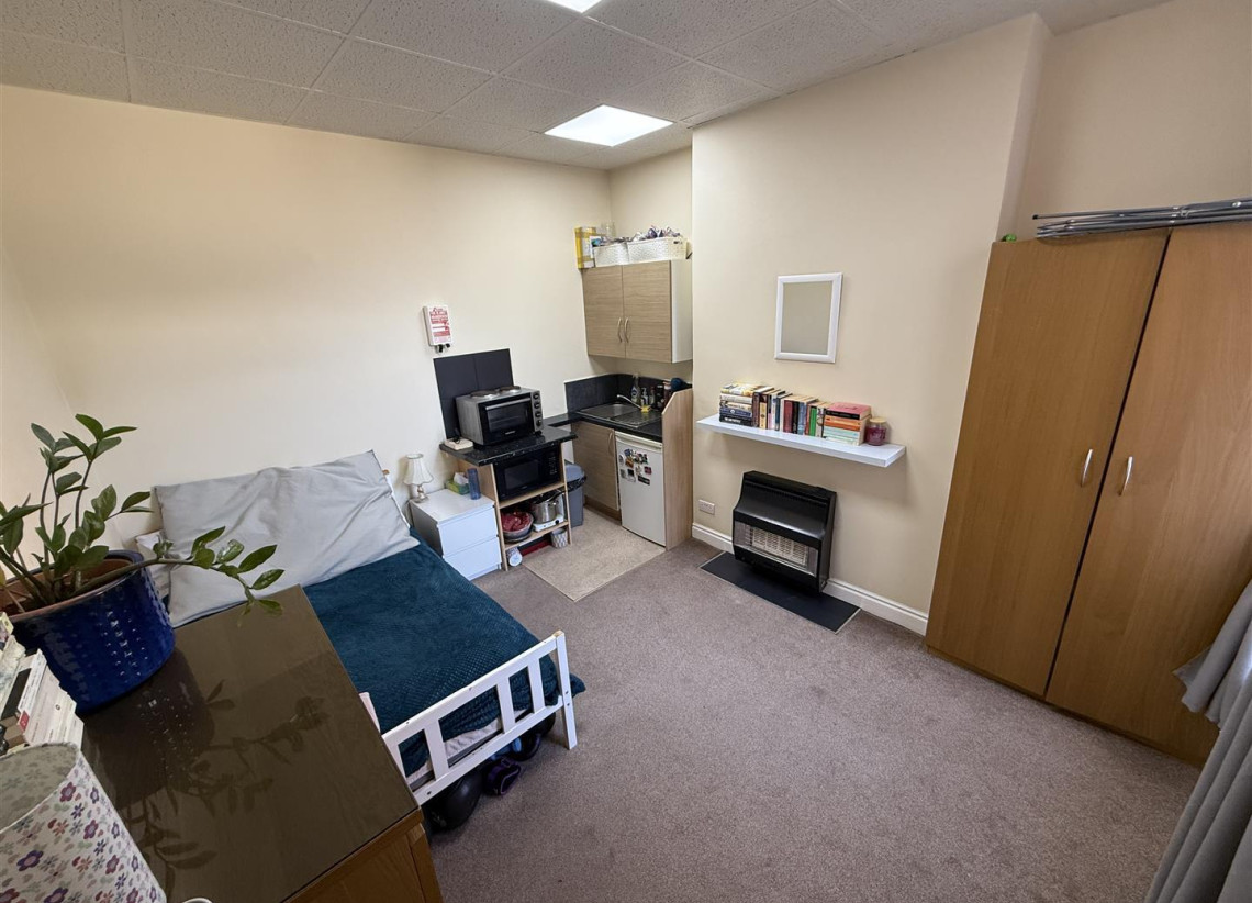 Flat 4 - First Floor Front Open plan room with carpet to flooring, kitchen area, 2 windows to front and a separate shower room