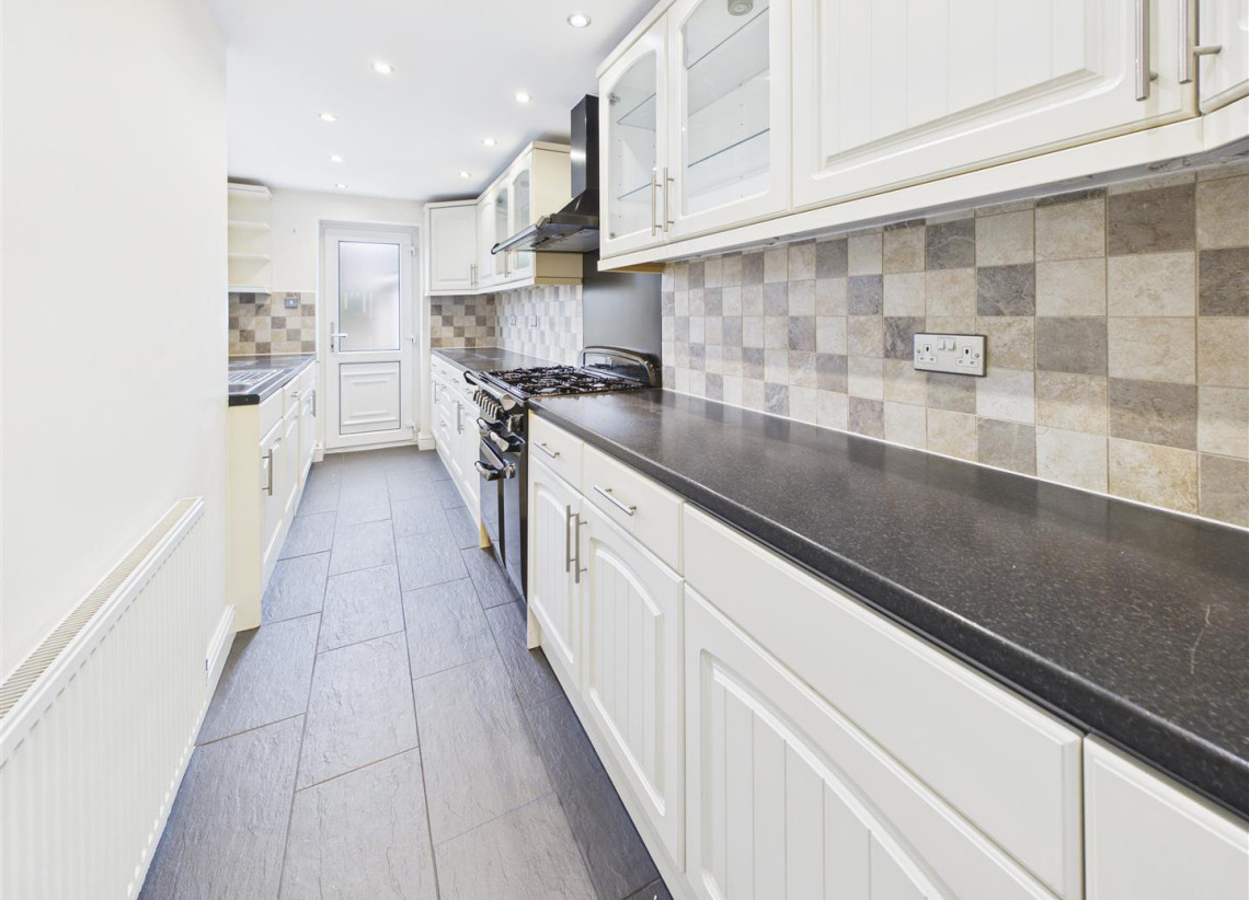 Kitchen - 5.33m x 2.10m (17'5" x 6'10") - Double glazed window to side, long galley style kitchen with a large range of wall and base units and range cooker.