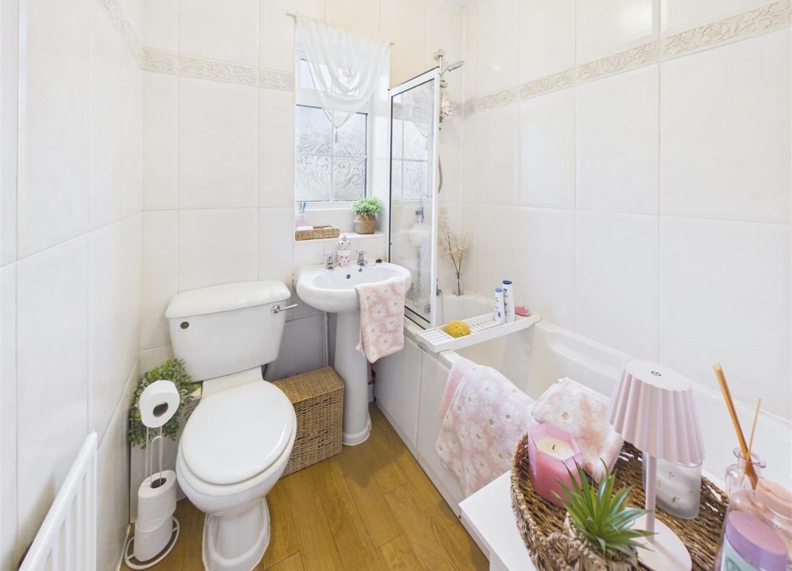 Bathroom - 1.76m x 1.54m (5'9" x 5'0") - Double glazed window with privacy glass. Fully tiled bathroom with white suite to include bath with shower over, W/C and hand wash basin.
